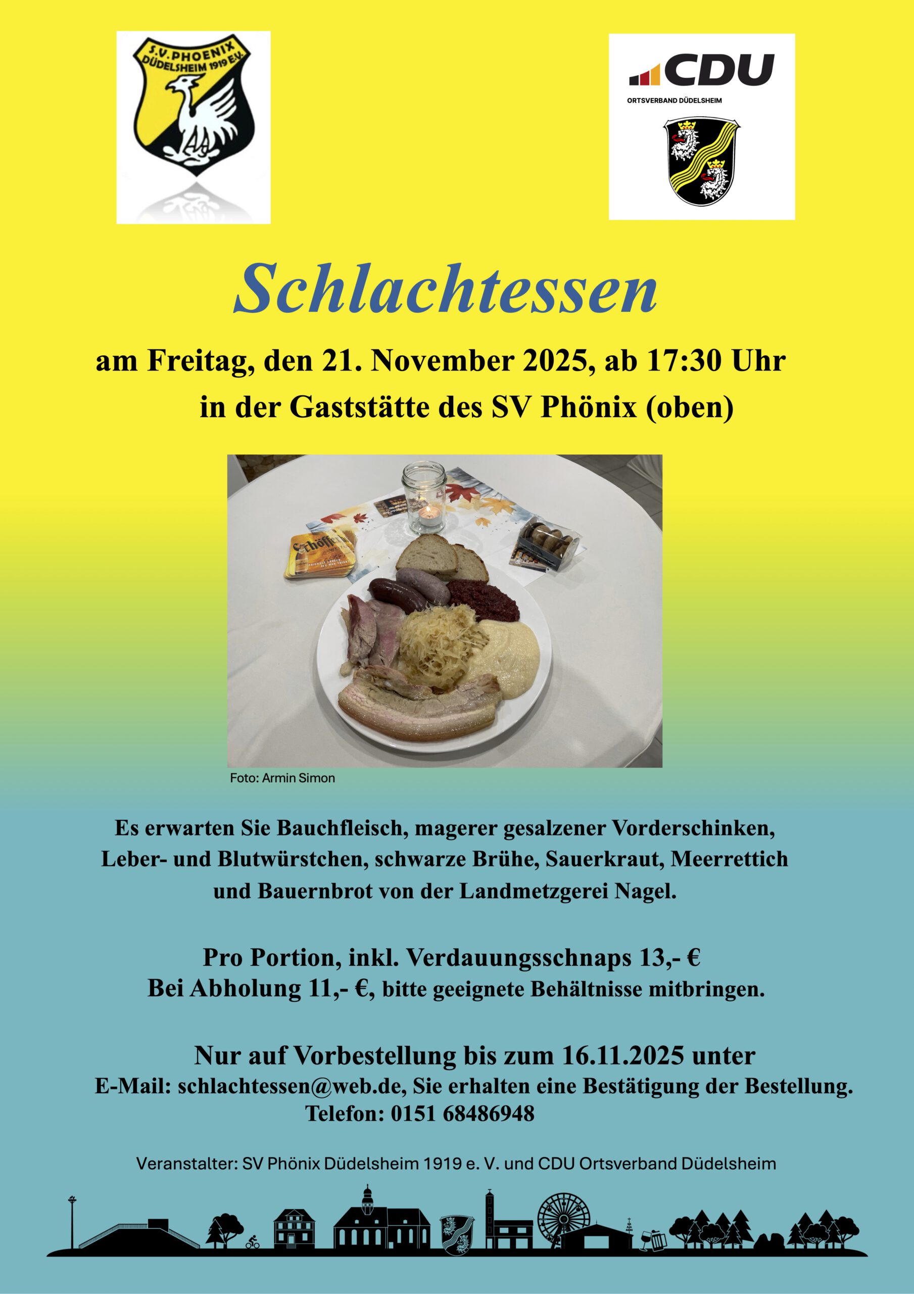 In der Gaststätte des SV Phönix Düdelsheim (Obergeschoss) findet am Freitag, 21. November wieder ein Schlachtessen statt. Dazu laden der CDU-Ortsverband und der SV Phönix ab 17.30 Uhr herzlich ein. Eine Vorbestellung bis 16. November ist erforderlich, Fleisch und Wurst kommen von der Landmetzgerei Nagel.