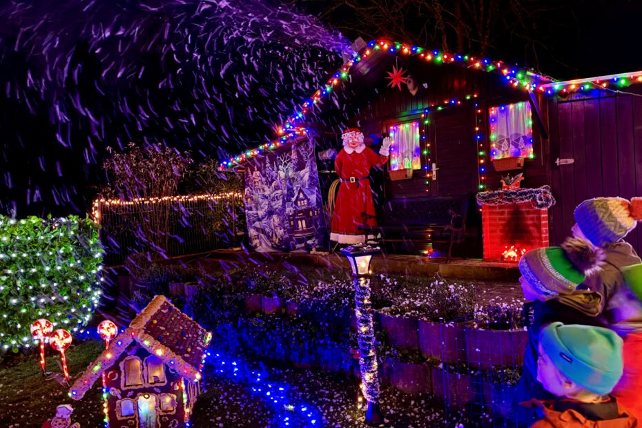 Da kommen echte Weihnachtsgefühle auf: An diesem Samstag hatte zum ersten mal in diesem Jahr das Düdelsheimer Weihnachtshaus im Einzel geöffnet. Über 40.000 LEDs sorgen für bunte Farben vor dem Haus und im begehbaren Garten, dazu liebevoll gebaute Häuser, Schlitten, Figuren. Für besonders großes Leuchten in den Augen der kleinen und großen Besucher sorgte die neue Schneemaschine.