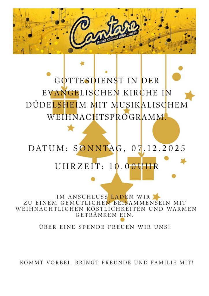 Der Chor Cantare vom Volkschor Düdelsheim tritt am 2. Advent um 10 Uhr im Gottesdienst der Evangelischen Kirche mit einem musikalischen Weihnachtsprogramm auf. Im Anschluss gibt es ein gemütliches Beisammensein mit weihnachtlichen Köstlichkeiten.