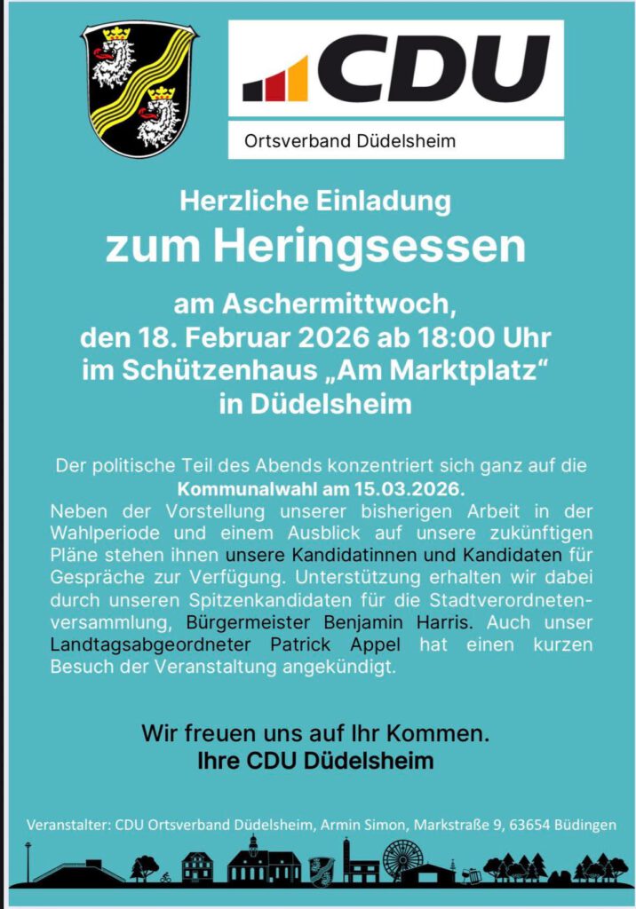 Die CDU Düdelsheim lädt zum Heringsessen an Aschermittwoch, 18. Februar, ab 18:00 Uhr ins Schützenhaus „Am Marktplatz“. Der politische Teil des Abends konzentriert sich ganz auf die Kommunalwahl am 15. März.