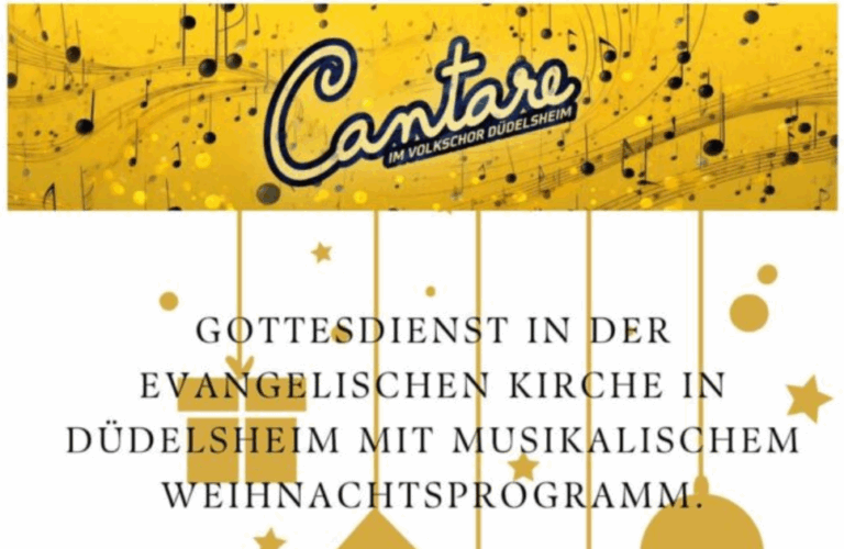 Der Chor Cantare vom Volkschor Düdelsheim tritt am 2. Advent um 10 Uhr im Gottesdienst der Evangelischen Kirche mit einem musikalischen Weihnachtsprogramm auf. Im Anschluss gibt es ein gemütliches Beisammensein mit weihnachtlichen Köstlichkeiten.