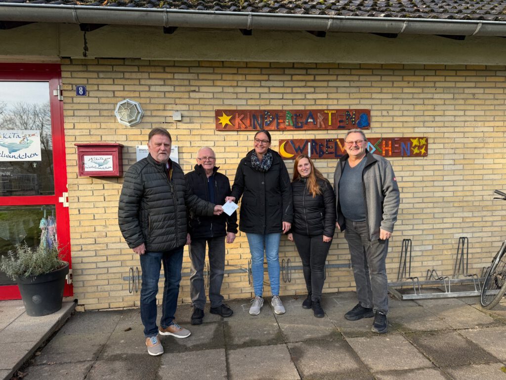 Zur Spendenübergabe trafen sich die Vertreter des Geflügelvereins, 1. Vorsitzender Herbert Weiser und 2. Vorsitzender Herbert Kuhl, sowie Nicole Matthäus aus dem Vorstand des Fördervereins, Kita-Leitung Anna Radeck und Ortsvorsteher Ramon Franke (von links). Der Förderverein bedankte sich herzlich für die großzügige Unterstützung, die direkt den Kindern zugutekommt.